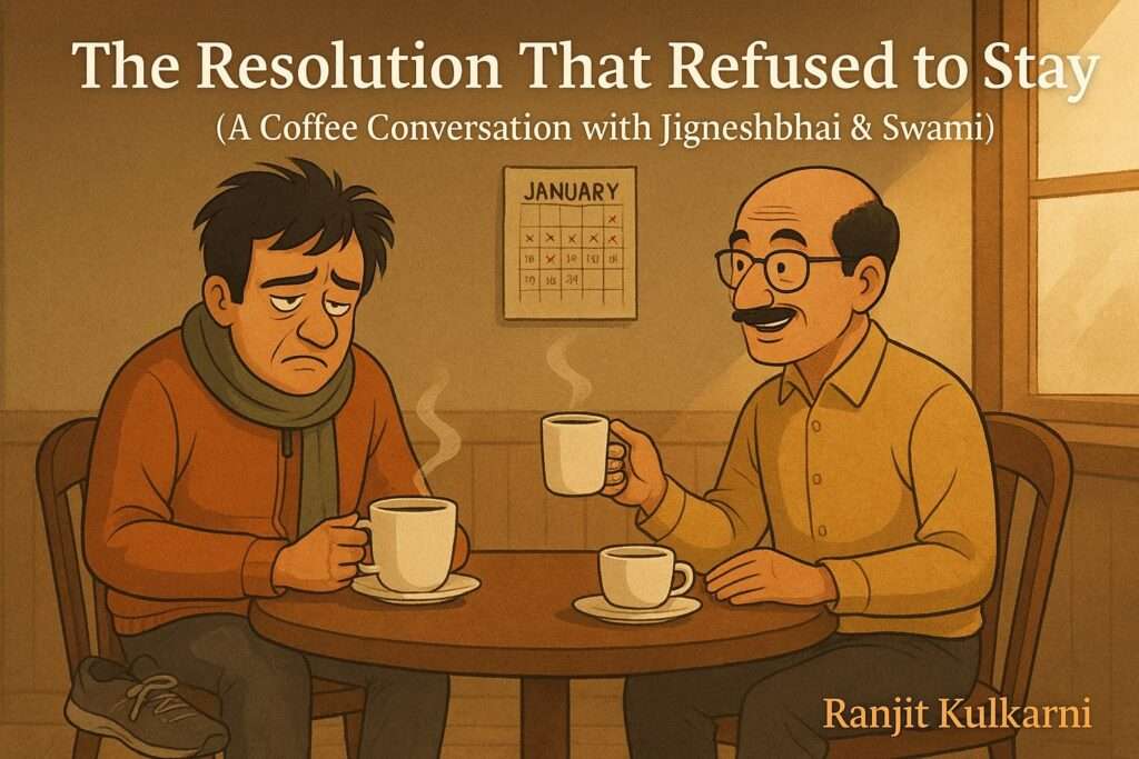 “Three days, Jigneshbhai!” Swami said, holding up three fingers as though announcing a world record. “Day one was fine. Day two I snoozed the alarm once. By day three, my back started aching, it was too cold, and the watchman gave me a strange look when I stepped out at 6 AM in my tracksuit. I took it as a sign.”
